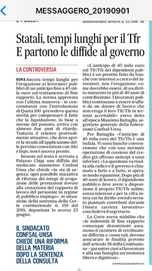 [Notizie_interesse] Pagamento TFR/TFS, continua la battaglia dell'UNSA.